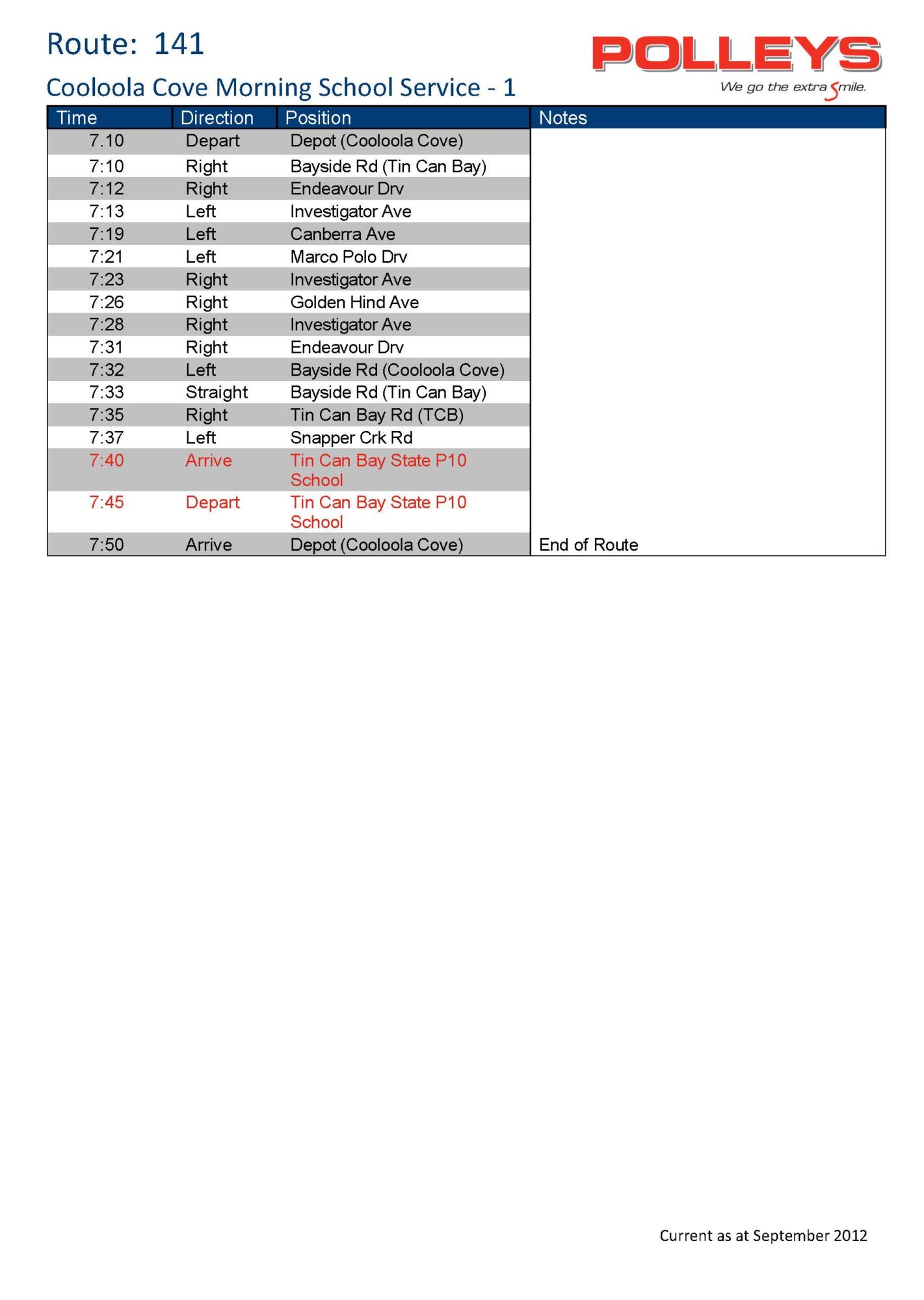 • Route 141 – Cooloola Cove Morning School Service